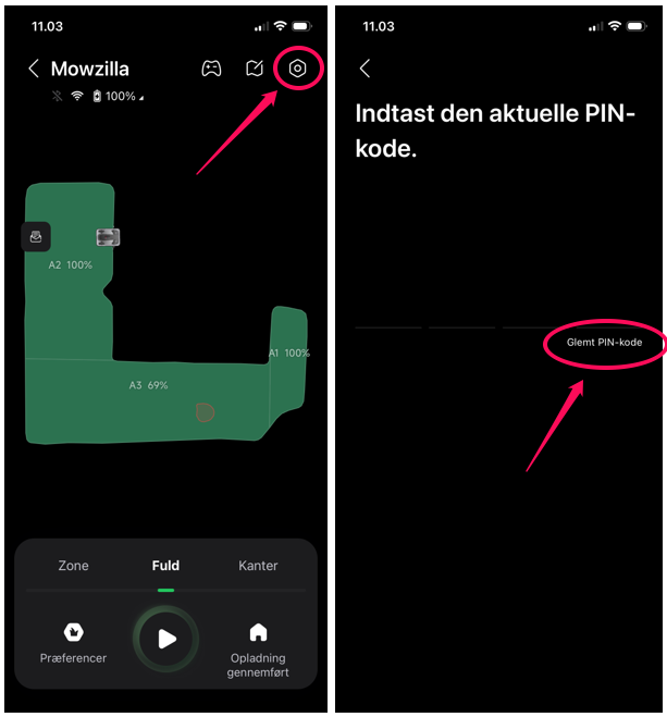 Enhed>Vælg robot>Indstillinger(tandhjul øverst, højre)>Sikkerhed og tyverisikring>Skift Pin-kode>Glemt PIN-Kode.